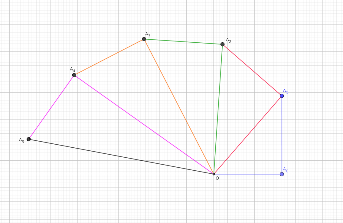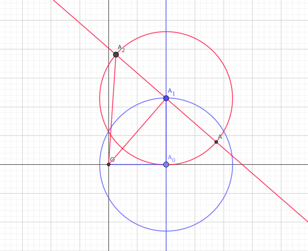 Pour tracer à partir de , puisque le triangle est rectangle en , on trace la perpendiculaire à la droite passant par , puis le cercle de centre et de rayon . Le point est à l'intersection de la droite et du cercle. Et on recommence... on trace la perpendiculaire à la droite passant par , puis le cercle de centre et de rayon . Le point est à l'intersection de la droite et du cercle